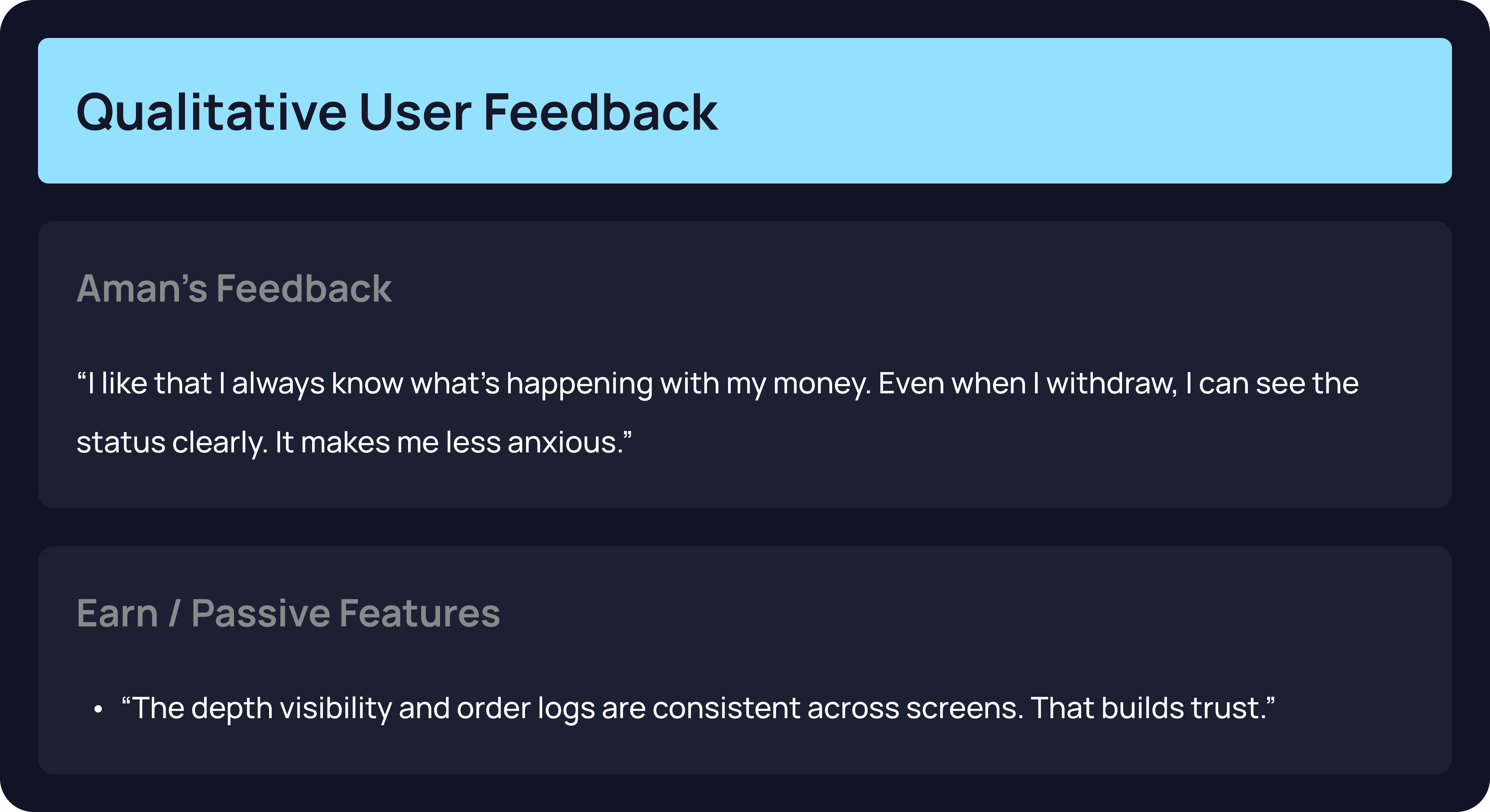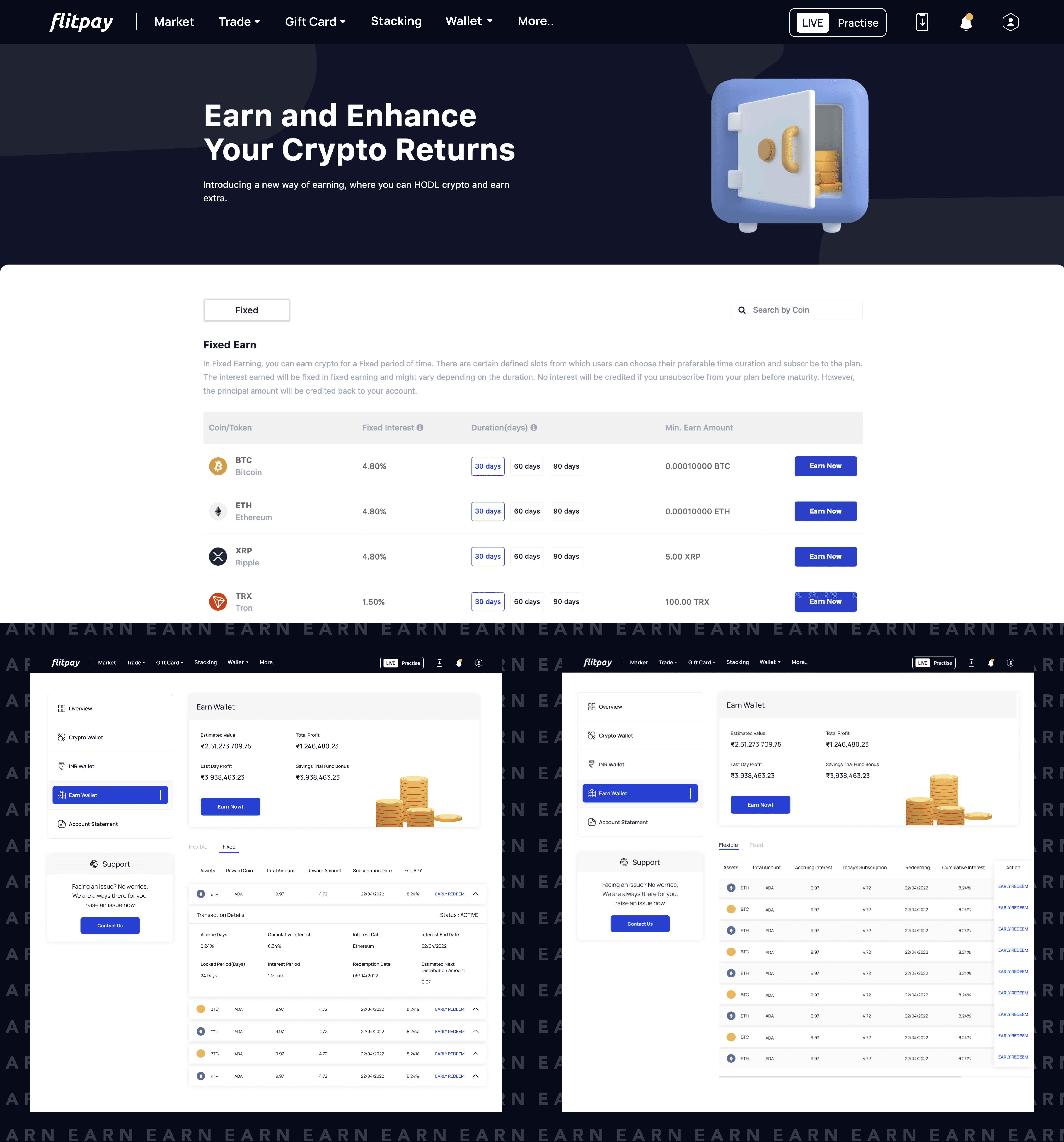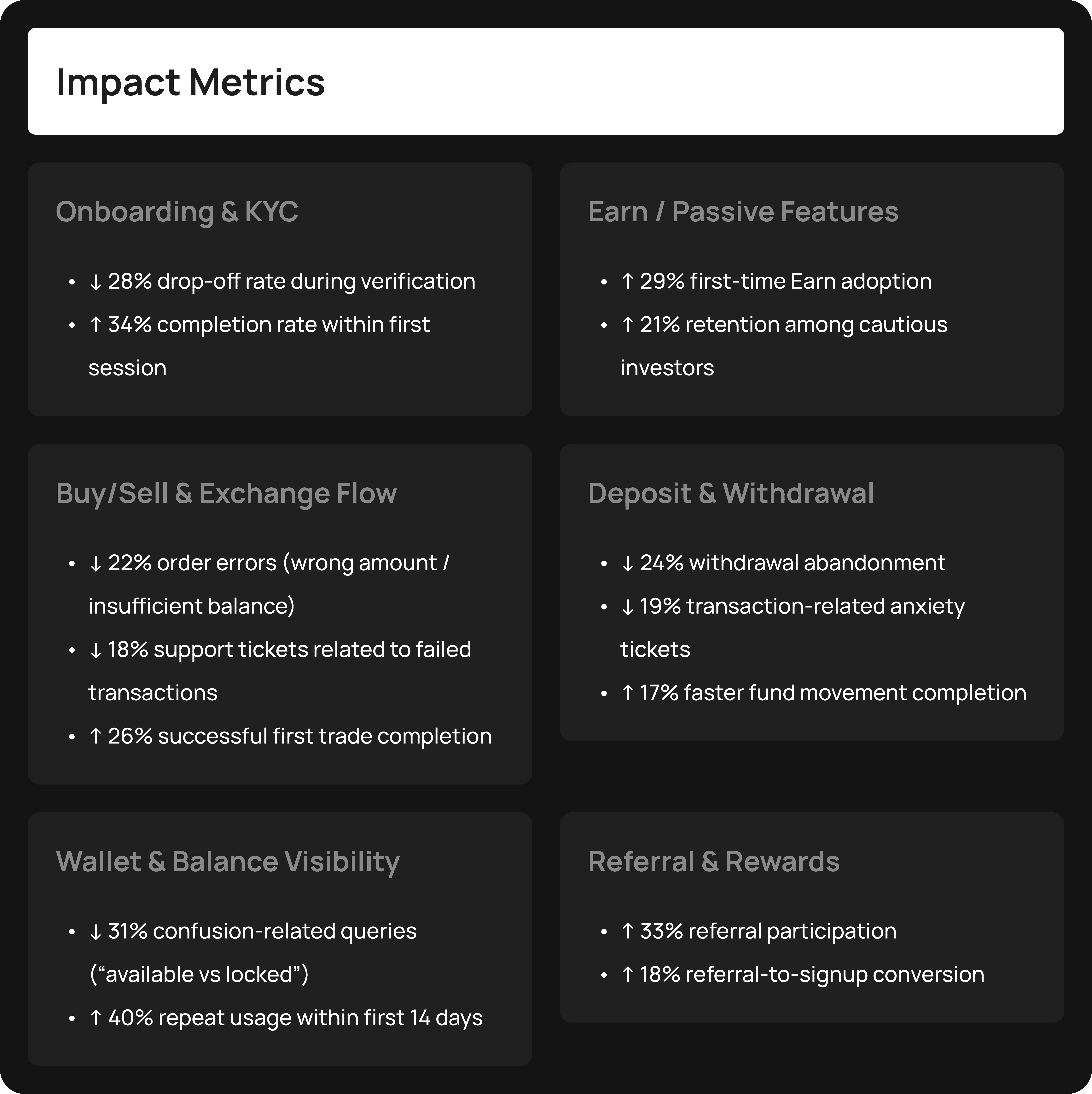 Solution: Modularized dashboards for Crypto Wallet, INR Wallet, and Earn Wallet with real-time balances and transactions.